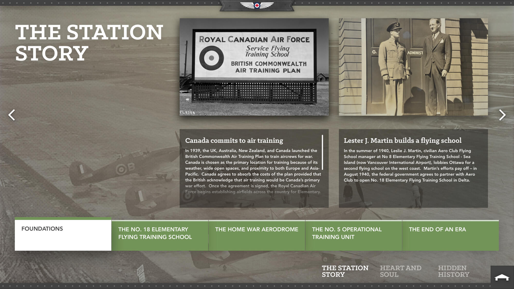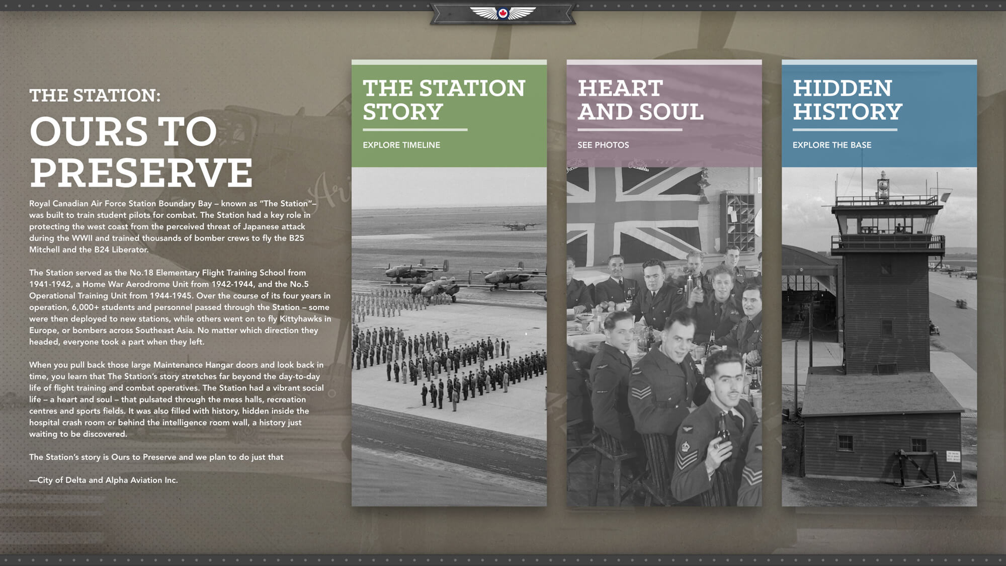 This is a digital interactive exhibit for Delta’s Boundary Bay Airport, revealing a previously unknown secret history as a Royal Canadian Air Force base to local Delta residents and visitors. The interactive exhibit showcases a diverse range of stories and photos connected to the airport during the World War II period.