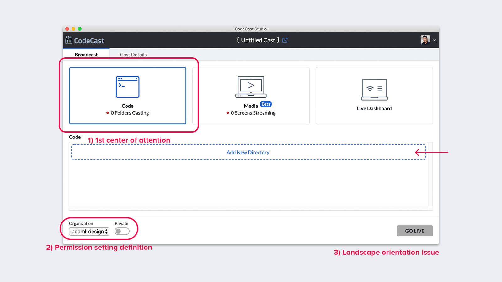 - The information hierarchy was unclear as it prompted the user to click “Code”, but “Code” is a tab. The user should start with “Add New Directory” instead, pointed with the arrow.
