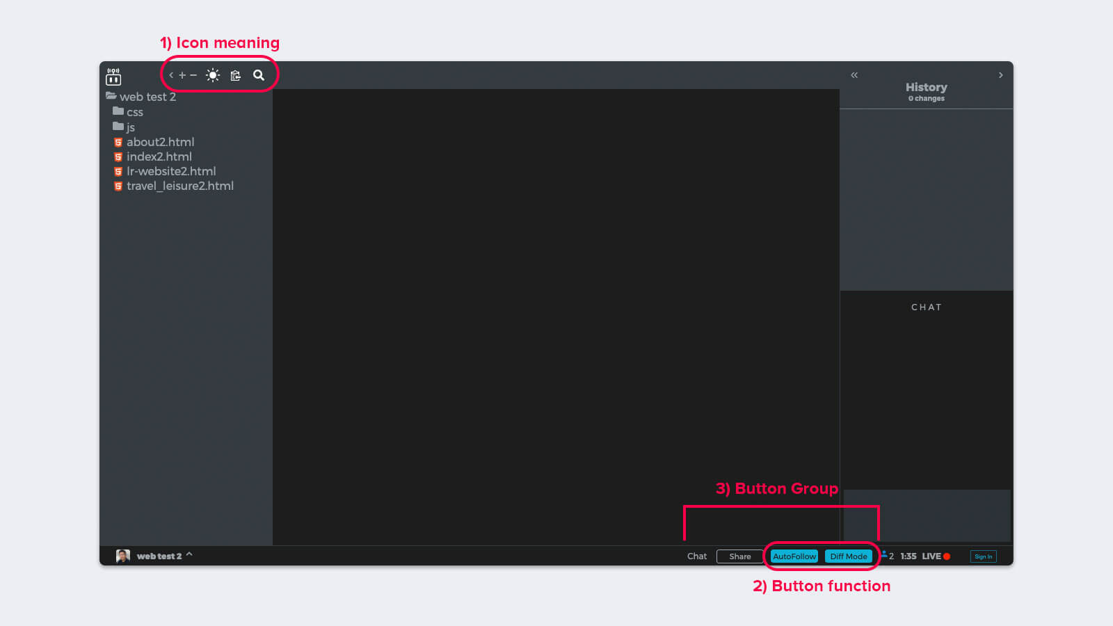- Buttons like AutoFollow and Diff Mode were unclear for their usage. Applying tooltips would be helpful to identify their meanings in the new app.