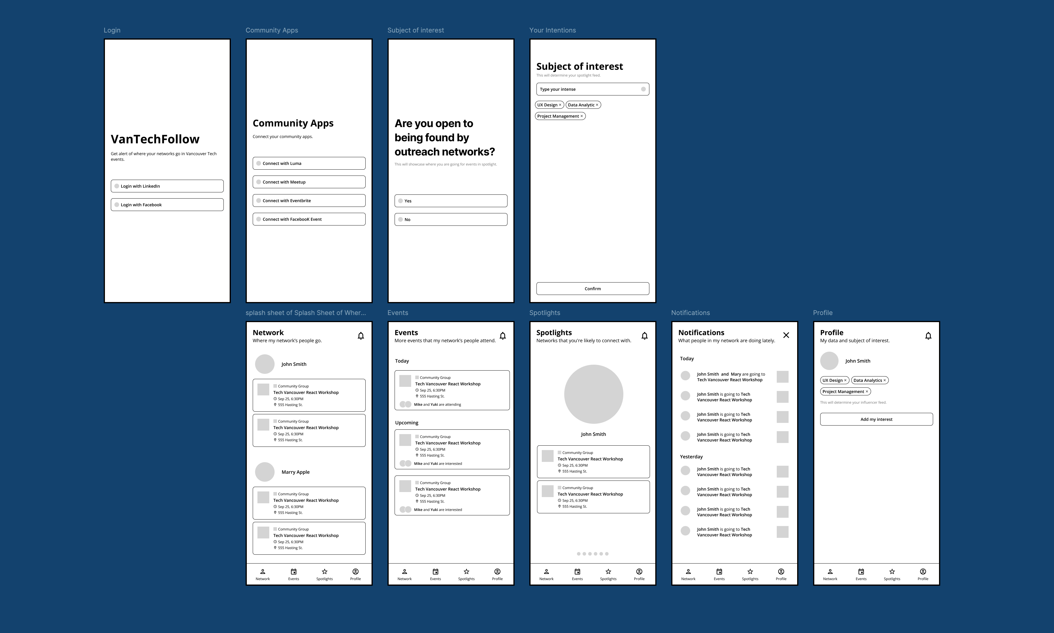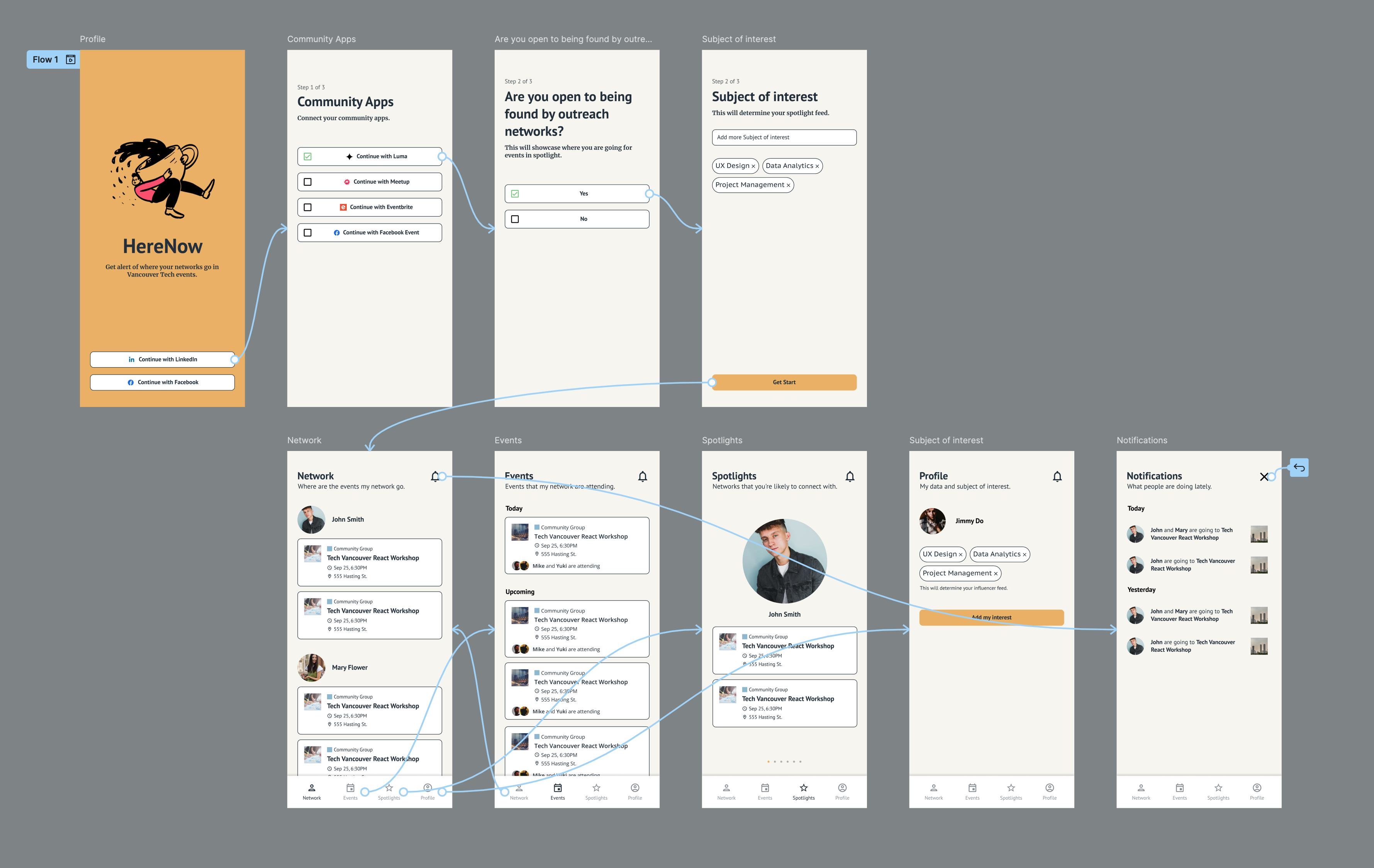 Building off the ideas from the brainstorming session, the app taps on the user's shoulder to show the events their contacts are going on and a spotlight feature for the outbound networks. This wireframe was used for testing and gathering feedback from other mentors in the hackathon event for further adjustments, such as the feature naming issues, and missing steps.