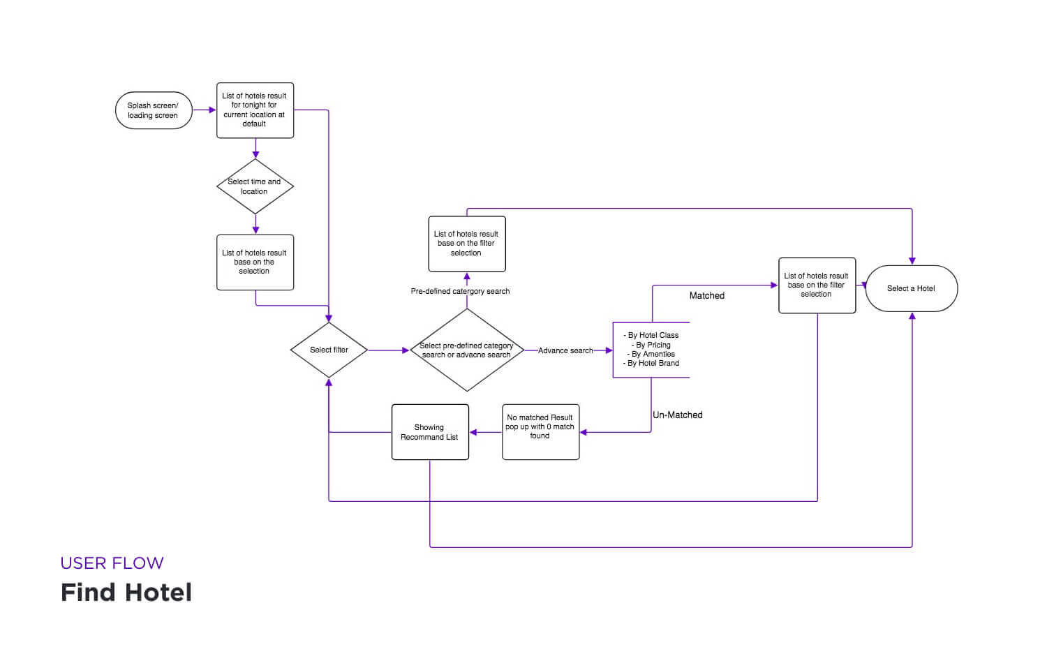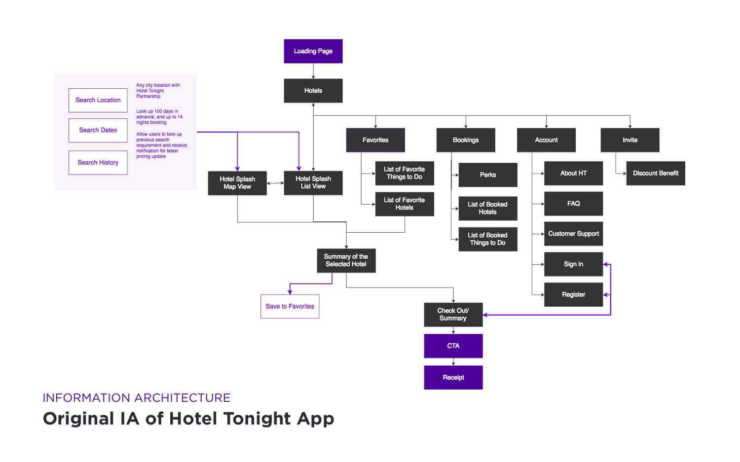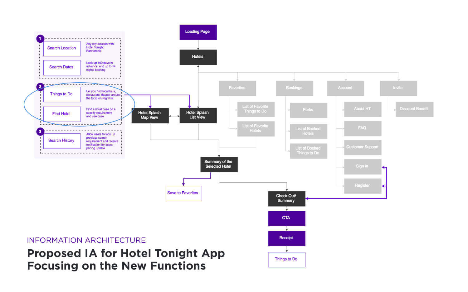 Instead re-defined the whole new app flow, I looked up the HotelTonight's existing IA to see if the new proposed functions could integrate to the initial app's system. I looked the user flow of proposed functions anticipating what might be needed in the UI.