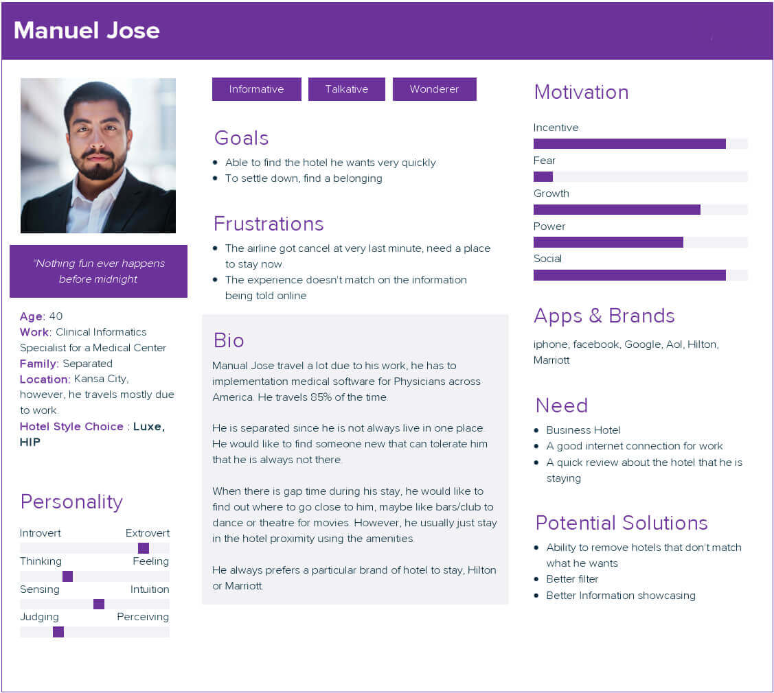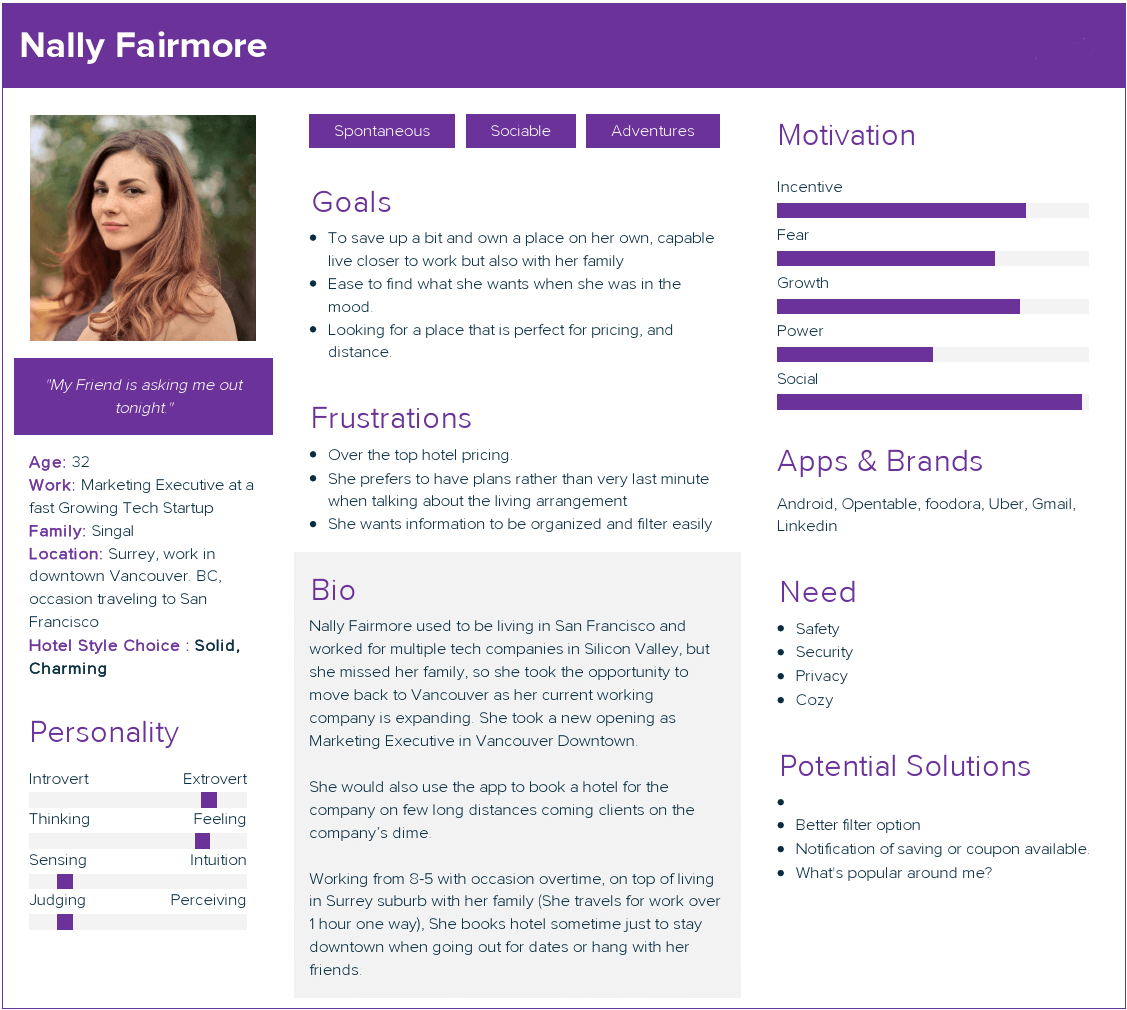 They usually book a hotel for vacation or leisure usage, They are flexible for what they looking when booking a hotel, but they would like to save a bit as they can when looking for a hotel base on my user group selection. They would say “planning is part of the exploration journey when planning their vacation”. They often choice Airbnb or hostel for different option.