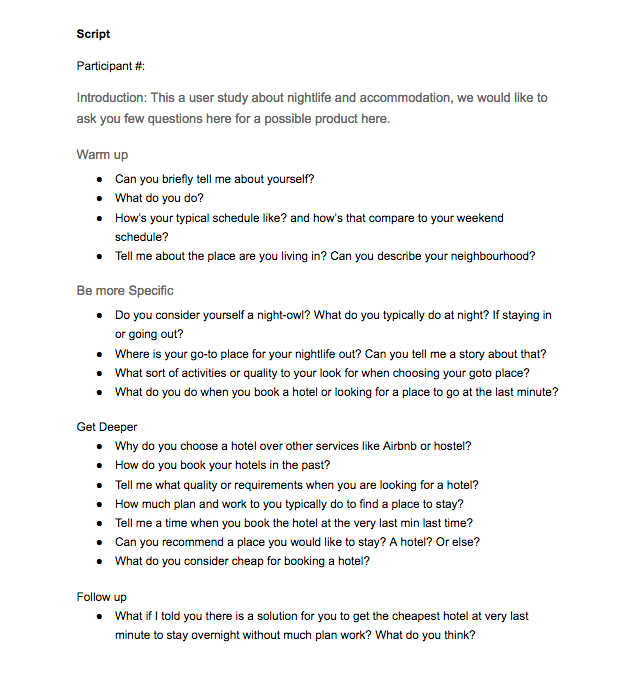 The research methods covered from casual conversation interviews, to live online text chat, and questionnaires. Questions like their booking preferences and nature of their use case were came out. View sample interview questions.