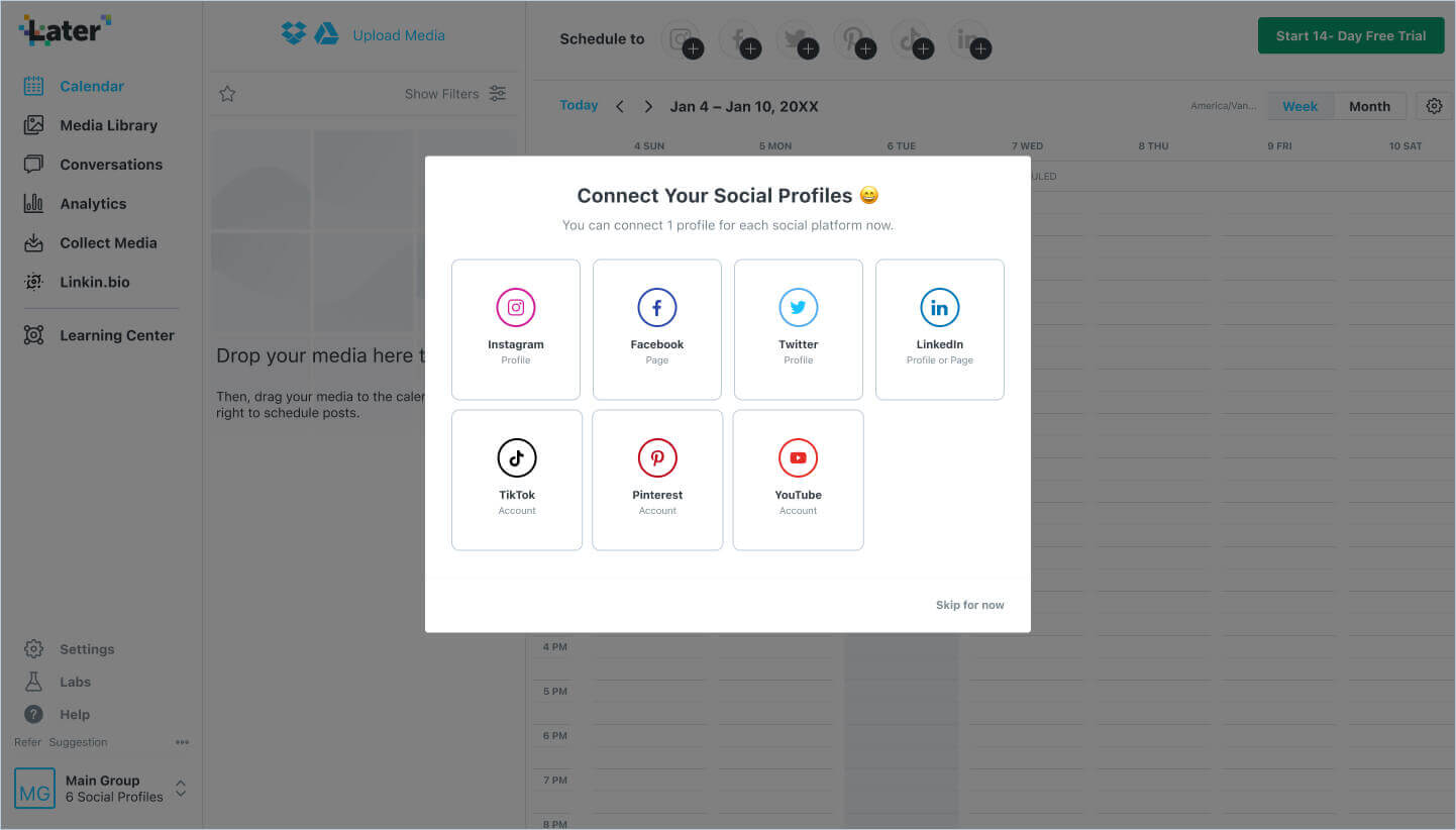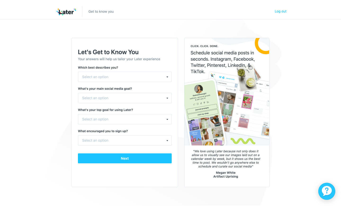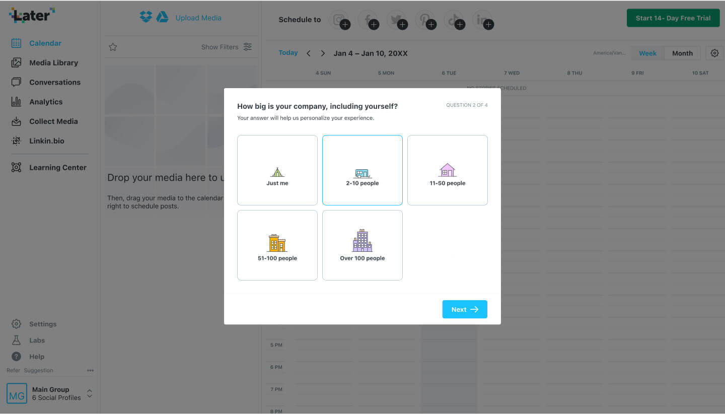 The new survey flow is integrated into the dashboard. This goal is to improve the precision of user data collection, identifying Later's most valuable customers and the customization of their experiences. Following the completion of the new survey, users will be directed to a personalized trial/pricing page based on their survey responses.